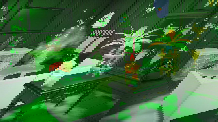 We can clearly see some plants, two candles to make the vibe, and of course, the smoke effect, with a little touch of spooky elements. Above all, the lighting addition from the Happy Home Paradise expansion is giving the room a super cool neon, green lightning effect. Invite over some friends and turn this room into a party place.