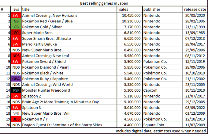Another impressive thing about the list was that the top 19 out of 20 were games owned by Nintendo. Bar Capcom’s Monster Hunter Freedom 3 on the PSP, the chart is a straight sweep for Nintendo, with studio classics like Mario Kart 8 Deluxe and Super Smash Bros. The only other third-party game other than Monster hunter was Square Enix’s Dragon Quest IX: Sentinels of the Starry Skies on the DS.