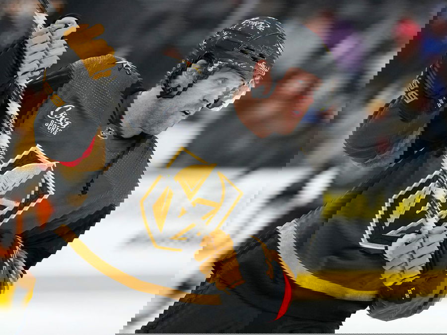 Oct 24, 2022; Las Vegas, Nevada, USA; Vegas Golden Knights center Phil Kessel (8) warms up before a game against the Toronto Maple Leafs at T-Mobile Arena. Mandatory Credit: Stephen R. Sylvanie-USA TODAY Sports/File Photo