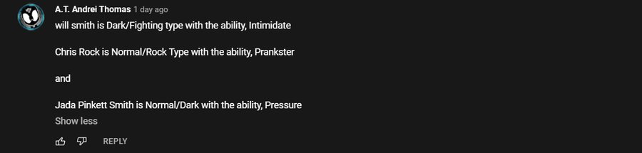 One comment read, ” Oh this was absolutely hilarious!!! 😂 Thanks for making me laugh today!” Whereas another Pokémon fan said, ” Will Smith is Dark/Fighting type with the ability, Intimidate. Chris Rock is Normal/Rock Type with the ability, Prankster and Jada Pinkett Smith is Normal/Dark with the ability, Pressure.”