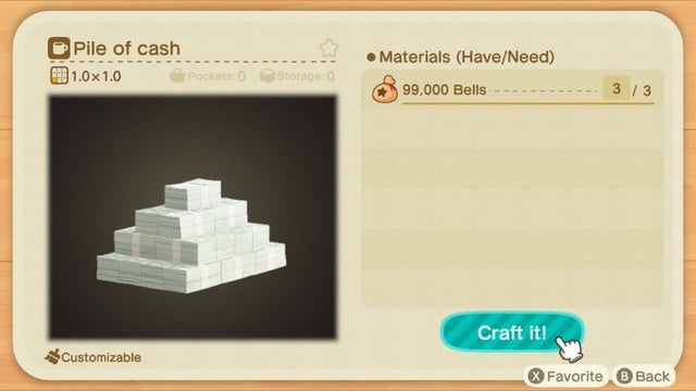 You can obtain this item from crafting, which requires 3× 99,000 Bells. The recipe for the Pile of Cash item can be obtained from snooty villagers. Interestingly, Pile of Cash is a very rare item and you might not be able to get your hands on the item for a month.