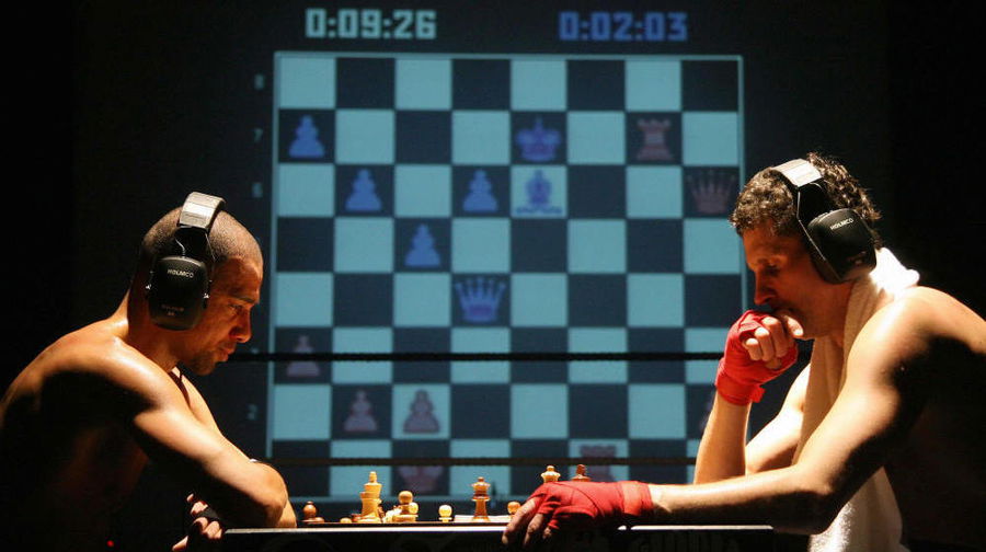 The participants then quickly don their boxing gear as the team removes the chess table, and it turns into a full-fledged boxing bout.