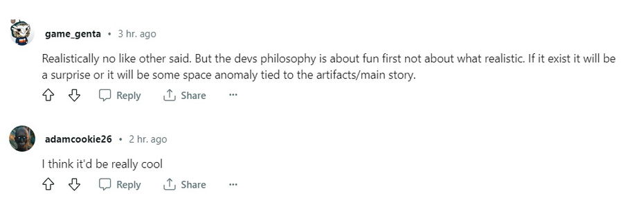 Throughout the thread, the fans were pretty excited and supportive-“Realistically no like other said. But the devs philosophy is about fun first not about what realistic. If it exist it will be a surprise or it will be some space anomaly tied to the artifacts/main story.”