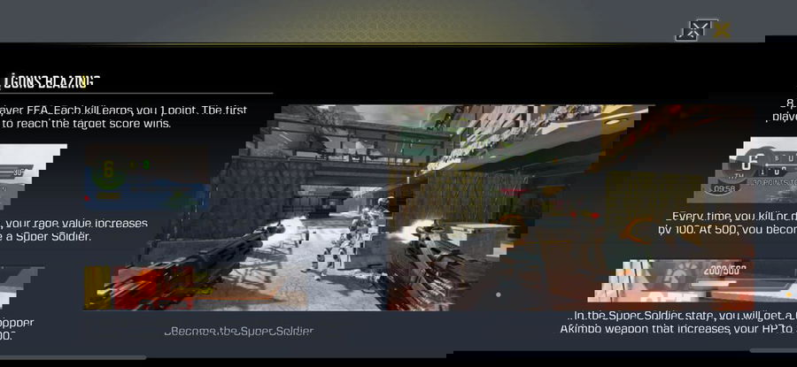 Getting a kill or dying will increase the ‘Rage’ counter with 100 points. Getting 500 points on the counter will allow them to turn into either Rambo or John McClane, who are ‘Super Soldier’. Super Soldiers will have their health increased to 300, and further to that, they will carry Akimbo Chopper LMGs.