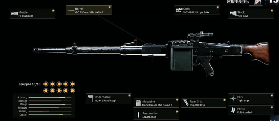 Barrel Atachment: VDD 890mm 32M Luftschutz. This barrel modification is a boon to the player. It greatly reduces recoil and increases accuracy. The sway that occurs when zoomed in is also reduced. However, it negatively impacts mobility traits, such as aim down sight speed, overall sprint speed, and the sprint to fire speed.