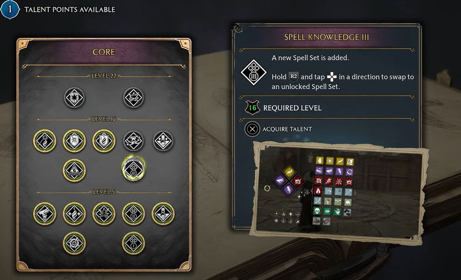 After you complete the mission, the Talents Tab would be active. In that, you will mainly find 5 categories- Dark Arts, Core, Spells, Stealth, and Room of Requirements. Each Talent branch is dedicated to certain features in the game. Players need to select the Core branch and move on to activate Spell Knowledge under the Core Talent tab. This unlocks extra slots for spells in the game.
