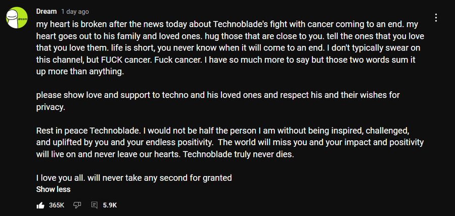 RIP Technoblade. An absolute legend in the community whose influence was felt far and wide. Fuck cancer