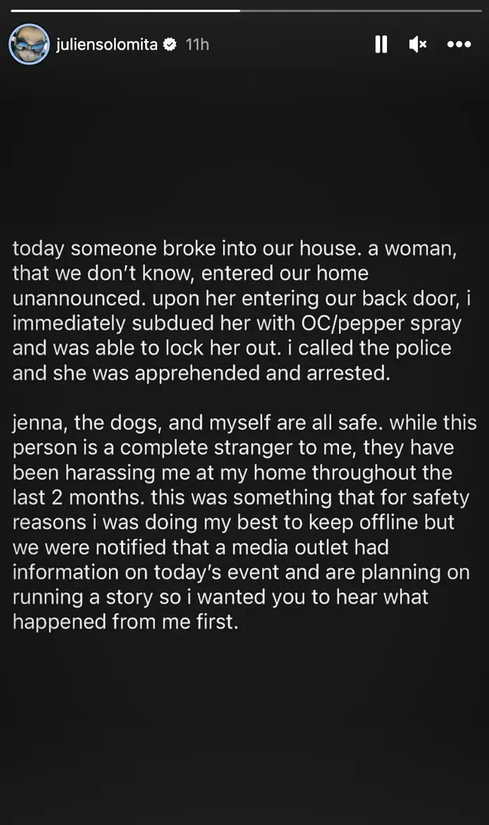 Solomita wrote on his Instagram story, “A woman, that we don’t know, entered our home unannounced. Upon entering our back door, I immediately subdued her with OC/pepper spray and was able to lock her out. I called the police, and she was apprehended and arrested.”
