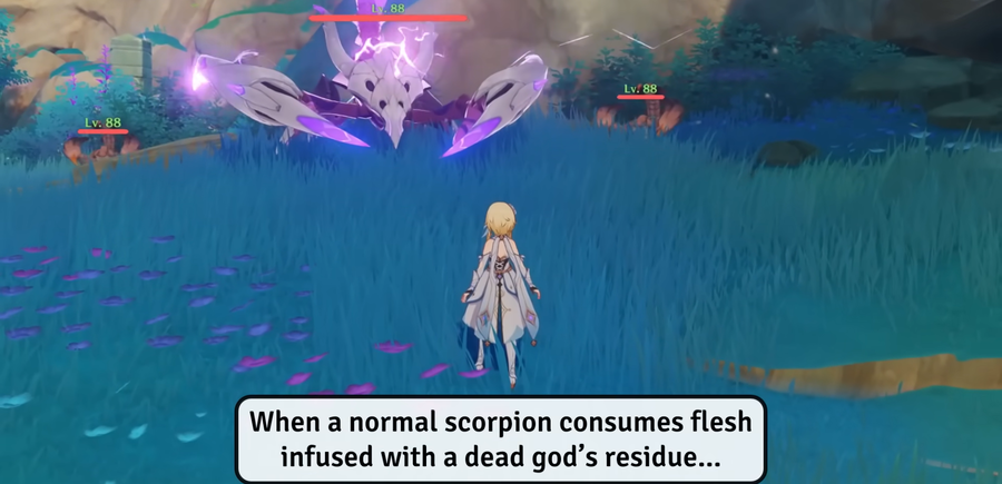Furthermore, the undigested pieces of the immortal flesh get slowly infused into their bodies like the bony shell of the monster. This shell’s composition then matches that of Crystal Marrow, hinting at a correlation between the two. Therefore, the lore and presence of Crystal Marrow and the nature of normal scorpions directly justify their presence in Inazuma.