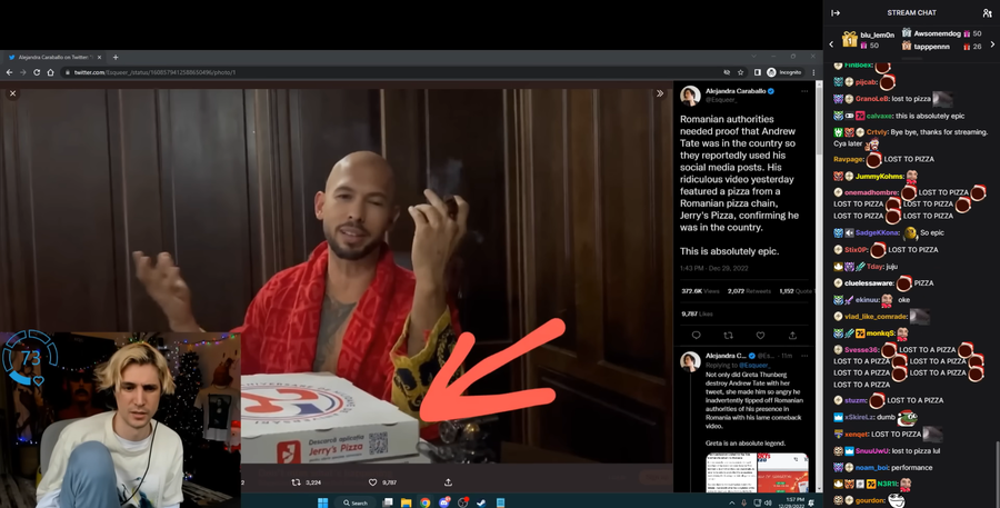 As tweeted by the account Pop Crave, “Andrew Tate reportedly inadvertently tipped off Romanian authorities of his presence in Romania with his response video to Greta Thunberg. The pizza boxes shown in the video are from Romanian chain Jerry’s Pizza.”
