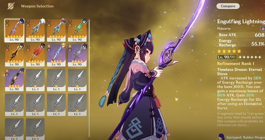 Other than that, the best free-to-play weapon option for her is Prototype Starglitter, because it also has energy recharge as a sub-stat. Although we can’t recommend using a five-star weapon on Yun Jin, if you really like her gameplay, then Engulfing Lightning is the finest weapon for her.