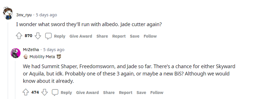 As soon as this rumor hit the internet, fans started pouring in their views. A Reddit user asked, “I wonder what sword they’ll run with albedo. Jade cutter again?”Another user anticipated, “When will Shenhe be released from no rerun jail.” To get a good view of the reactions, one can see below: