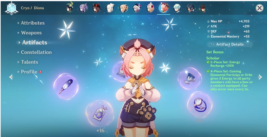 miHoYo has not released great five-star artifacts for support characters, and it may work in the future. Surprisingly, some four-star artifacts like Scholar, The Exile, and Instructor are equally great. All these artifacts have a certain place in many team compositions. Diona is one of the best support characters, and Scholar’s 4 set bonus helps a lot in unleashing her true potential.