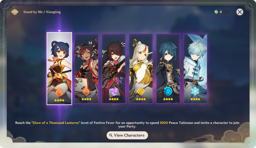 To unlock the free 4 star character, you will need to gather enough special event currencies. They have to push the festive fever till it achieves ‘ Glow of a Thousand Lanterns’ and offer 1000 peace talisman to invite one 4-star character from Liyue to join your party.