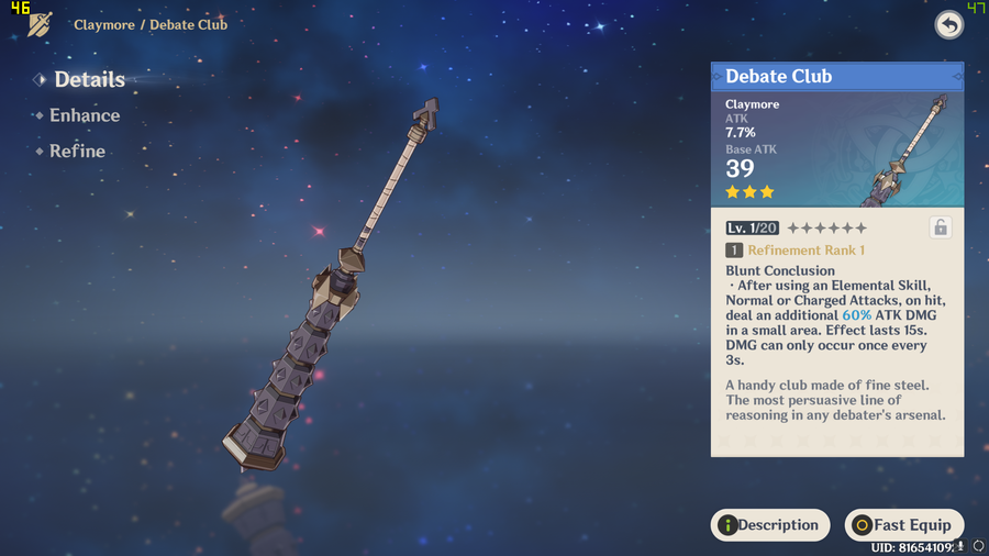 The debate club would be an ideal choice if you are lacking a good Claymore weapon to pair up with your character. It has the same drop rate from the Gacha as every other weapon on the list, so expect to get the weapon to maximum refinement.