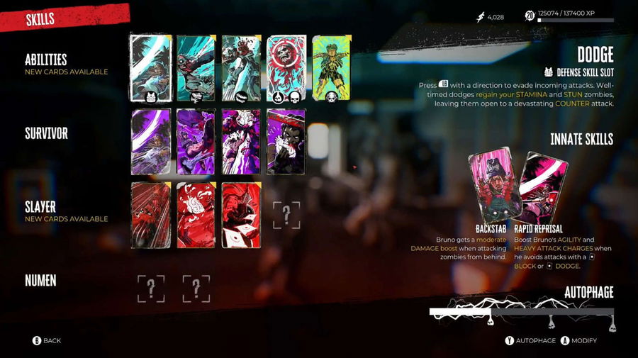 - Bruno: He is a hustler who committed heists prior to the zombie apocalypse. Further, his innate skills grant him a minor Damage Boost and a Boost to his Agility and Heavy Attack Charges when he blocks or dodges attacks.