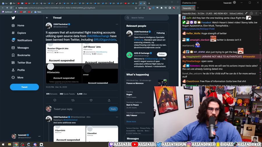 Twitch streamer HasanAbi reacts to Jack Sweeny’s Twitter account getting banned regarding the tracking of planes of Elon Musk