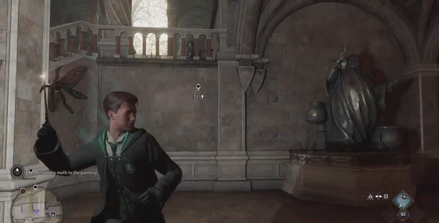 Cast Lumos once again as you approach the moth and, from that point on, it will follow you anywhere you choose to go under the control of the wand. Then return to the staircase and the wall. Once there, just put a stop with the help of Lumos spell, and the moth will slide into place in the picture.