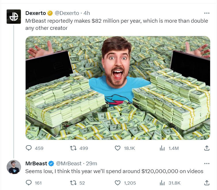 That means MrBeast earns way more than $82 million per year. So, just imagine what will be his net worth! And as a content creator, this is a huge achievement. His revelation took everyone by storm. He stated that he will spend around a staggering $120 million on videos this year.