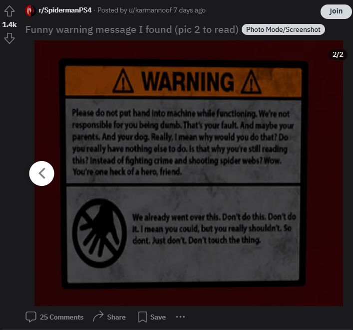 A Reddit user named karmannoof shared a few images of a warning sign and spotted the secret message on it. The message that has been conveyed sarcastically warns players to avoid putting their hands in the machine while it’s on. In addition to that, it recommends users spend their time-fighting crime and shooting spider webs in Marvel’s Spider-Man.