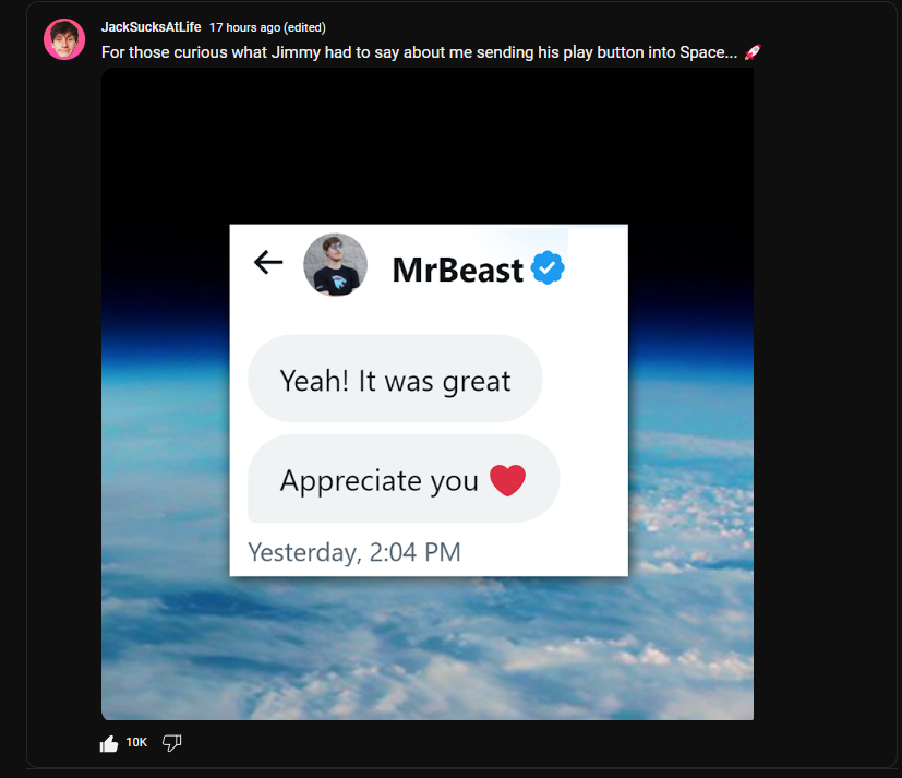 Jack proudly posted the screenshot of his conversation with Jimmy about the Play Button’s fate. Jack posted it on his channel’s community tab to let his fans know about what MrBeast thought about his possession having a journey in the space.