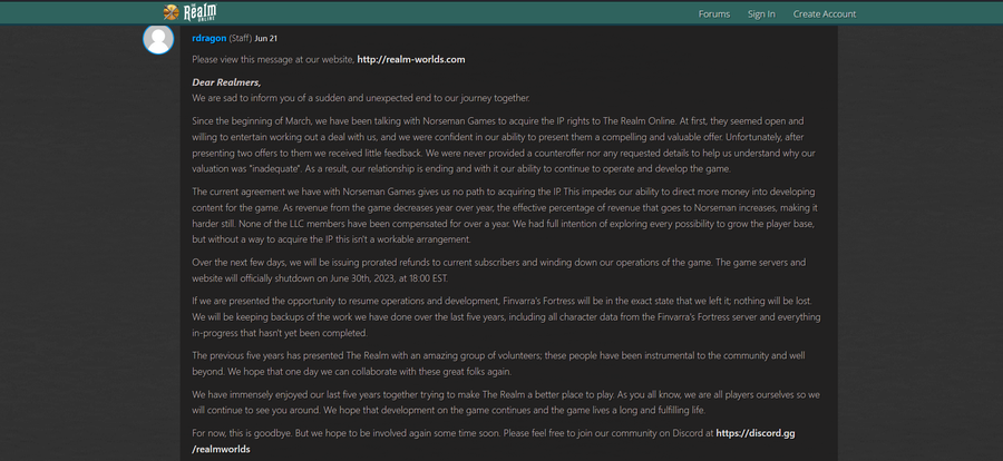 Realm Worlds repeatedly tried to acquire the IP for Realm Online from Norseman Games. However, they received little response from Norseman, after continually putting in the effort for a deal since March. As a result, the game will shut down on June 30th. With no way of paying members of their team for the hard work they put in, the choice to shut it down seemed like the only option if Realm Worlds could not acquire the IP.