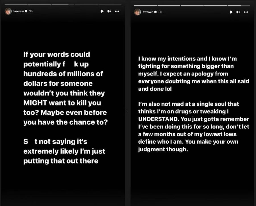 On November 30, 2022, FaZe Clan Rain posted on his Instagram stories a series of messages. According to them, he wants to share some sensitive data that could “expose” some big people and cost them millions of dollars. He also stated that revealing this information could also potentially become a threat to his life.