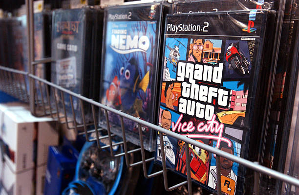UNITED STATES – APRIL 14: Video game “Grand Theft Auto Vice City” is on display at an electronics store in New York, April 14, 2004. CEO Jeffrey Lapin resigned as the company delayed some game releases and forecast a loss this quarter. (Photo by Jennifer S. Altman/Bloomberg via Getty Images)