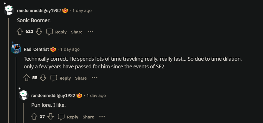 One such theory presented by the fans was Street Fighter being a sliding timeline. Another theory suggested due to his attacks, he spends a lot of time traveling fast. So due to time dilation, only a few years have passed for him since the events of SF2. However, many fans had some quippy remarks about this revelation.