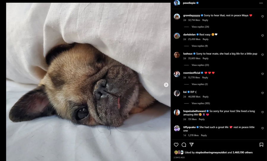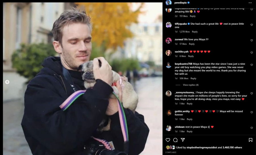 Immediately after PewDiePie informed about the death of Maya in his socials, his supporters showered the post with condolences. The community joined in sharing the grief with their favorite YouTuber.