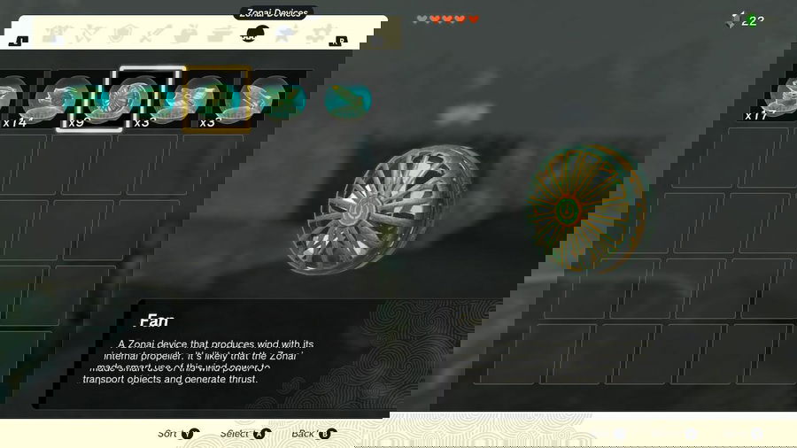 This one would again give players fans, but it also includes the wing and hover stones. For those who have yet to start the game, the wing is one of the most excellent ways to travel across this new Hyrule. Just slap a fan on one and fly away!