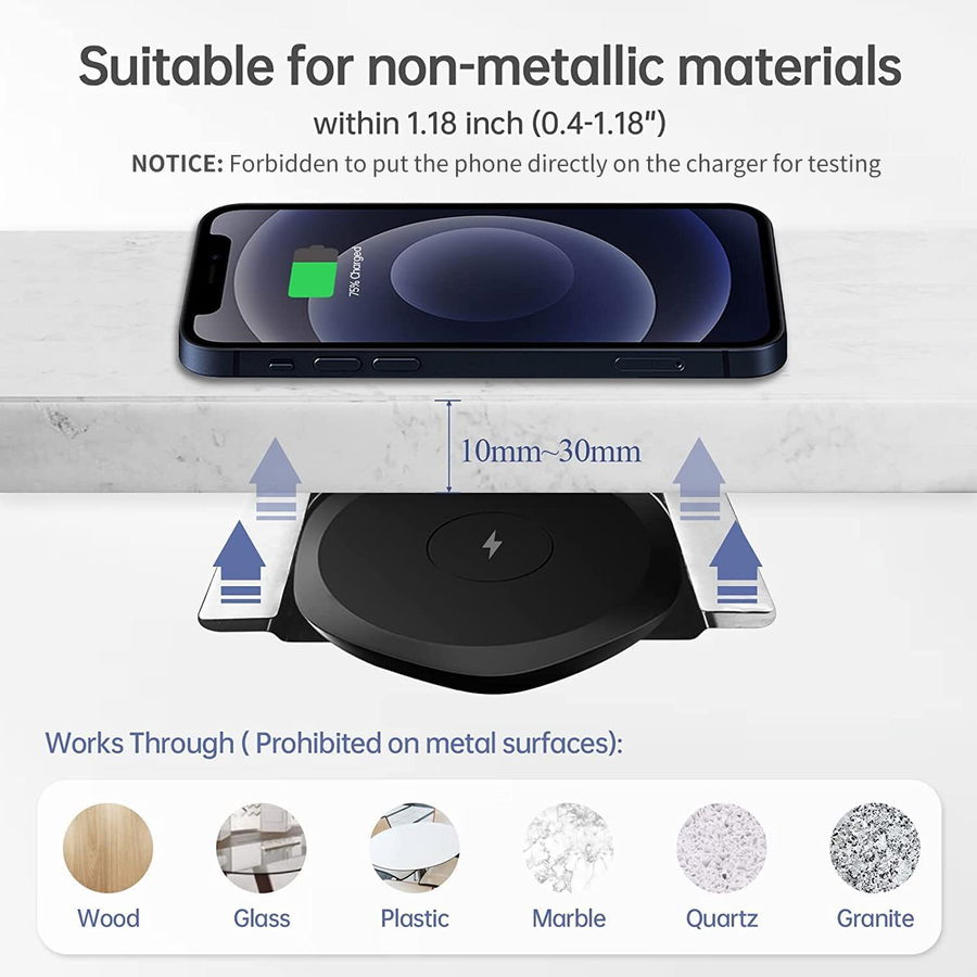 8) JiffyPoint Invisible Wireless Charger- Transform an area on your desk to a charging point without drilling or ruining your desk. Mount the invisible charger under your desk with the help of the provided magnets. Be sure to check the thickness of your desk before buying the product.