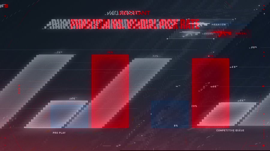Vandal has emerged as the preferred gun in the game. The gun has a significantly higher pick rate that tallies up to 76% in competitive play and 72% in pro play. One of the main reasons for Vandal being a preferred gun is because of Phantom’s non-lethal headshots. Vandal (disregarding wall bangs) gives 160 damage from any range while Phantom’s damage scales down as distance increases.