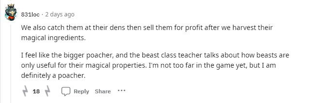 There are more such ‘heinous’ actions associated with the main character. Through gameplay, one can become a poacher of mystical animals. Selling them at Hogsmeade provides one with the needed coins to buy in-game items.