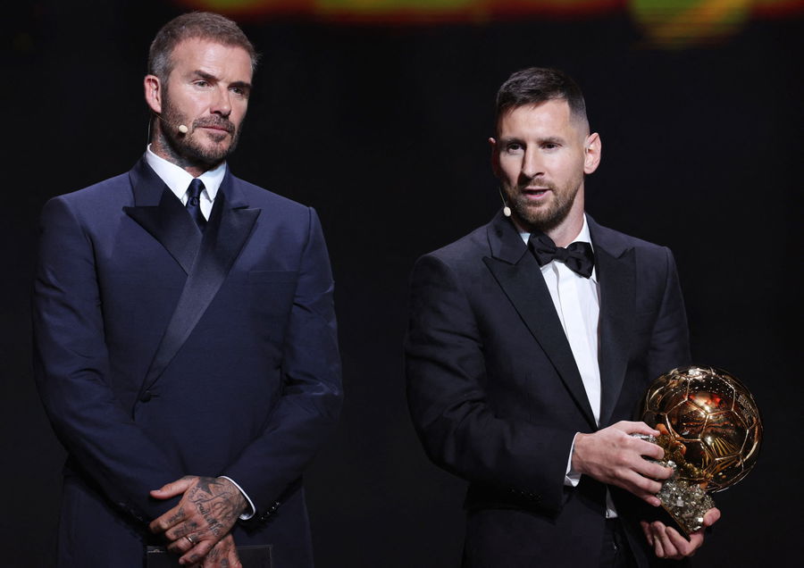 Soccer Football – 2023 Ballon d’Or – Chatelet Theatre, Paris, France – October 30, 2023 Inter Miami’s Lionel Messi after being awarded the men’s Ballon d’Or by co owner David Beckham REUTERS/Stephanie Lecocq