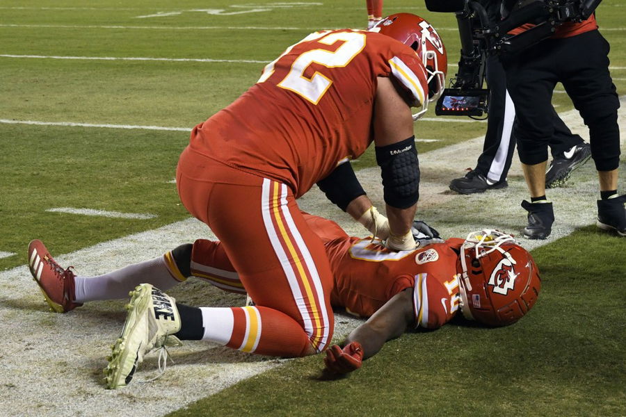 Kansas City Chiefs offensive lineman Eric Fisher (72) pretends to do CPR on wide receiver Tyreek Hill (10) after Hill scores a touchdown during the second half of an NFL football game against the Cincinnati Bengals in Kansas City, Mo., Sunday, Oct. 21, 2018. The Chiefs won, 45-10. (AP Photo/Reed Hoffmann)
