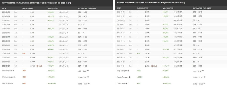 The daily average count of both these stars also points at something similar. Shroud has a daily average count of 108,055 with a weekly of 756,385 views. Whereas Call of Duty pro has 63,426 daily and 443,982 weekly views.