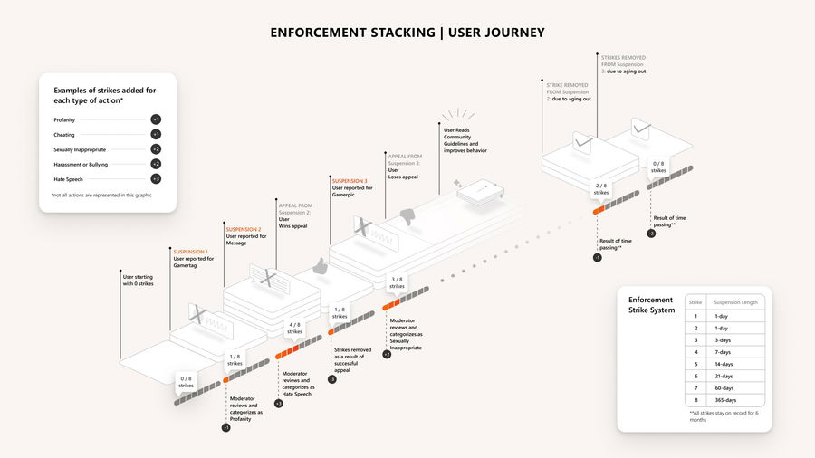 The strike-based enforcement system is a new Xbox program that is focused on reducing toxic behavior from Xbox platforms. In the new system, Xbox players will be assigned 1 strike for every offensive behavior. Every offense carries differing degrees of repercussions and the punishment will be based on the magnitude of the crimes. Every strike also be valid for six months and will result in more severity in punishment if the next offensive activity is within that time period. 8 strikes will result in a year-long ban.