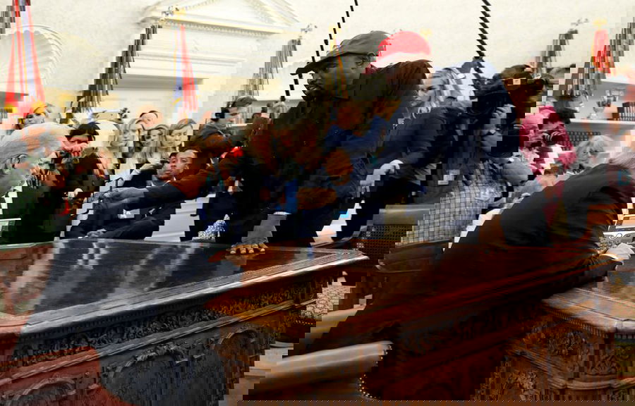 Rapper Kanye West shows President Donald Trump his mobile phone during a meeting in the Oval Office at the White House in Washington, U.S., October 11, 2018. REUTERS/Kevin Lamarque