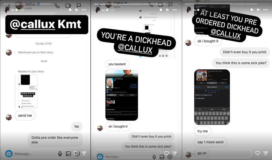 Callux then published a screenshot of his pre-ordered copy of “Voices,” while threatening JJ with a negative review of his song if he said one more word. The Sidemen star didn’t reply to Callux’s DM. Instead, he posted the full conversation on Instagram with the caption, “At least you pre-ordered d*ckhead Callux.”