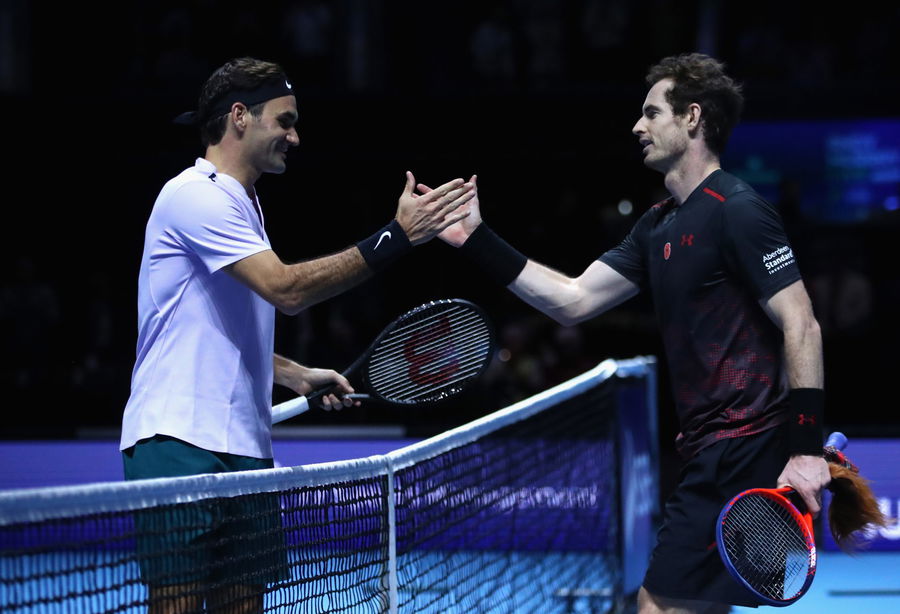 GLASGOW, SCOTLAND – NOVEMBER 07: Andy Murray congratulates winner, Roger Federer on victory following their match during Andy Murray Live at The Hydro on November 7, 2017 in Glasgow, Scotland. (Photo by Clive Brunskill/Getty Images for Andy Murray Live)