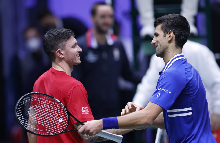 Tennis – Davis Cup Finals – Group F – Serbia v Austria – Olympiahalle, Innsbruck, Austria – November 26, 2021 Serbia’s Novak Djokovic and Austria’s Dennis Novak shake hands after their match REUTERS/Leonhard Foeger