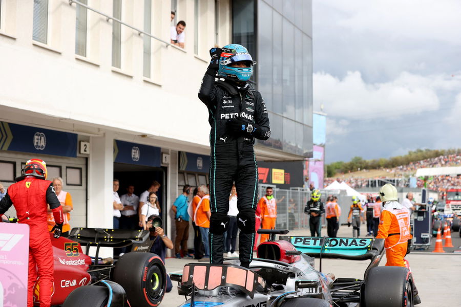 Formula One F1 – Hungarian Grand Prix – Hungaroring, Budapest, Hungary – July 30, 2022 Mercedes’ George Russell celebrates after qualifying in pole position REUTERS/Bernadett Szabo