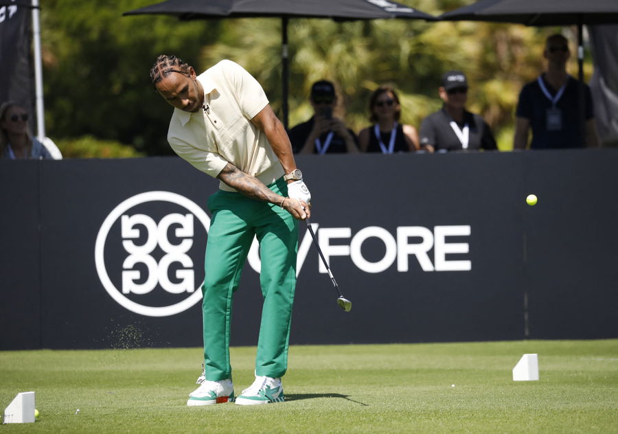 Formula One F1 – Tom Brady and Lewis Hamilton host an event in Miami – Miami Beach Golf Club, Miami, Florida, U.S., – May 4, 2022 Lewis Hamilton plays golf with Tom Brady at Miami Beach Golf Club ahead of the Miami grand prix REUTERS/Marco Bello