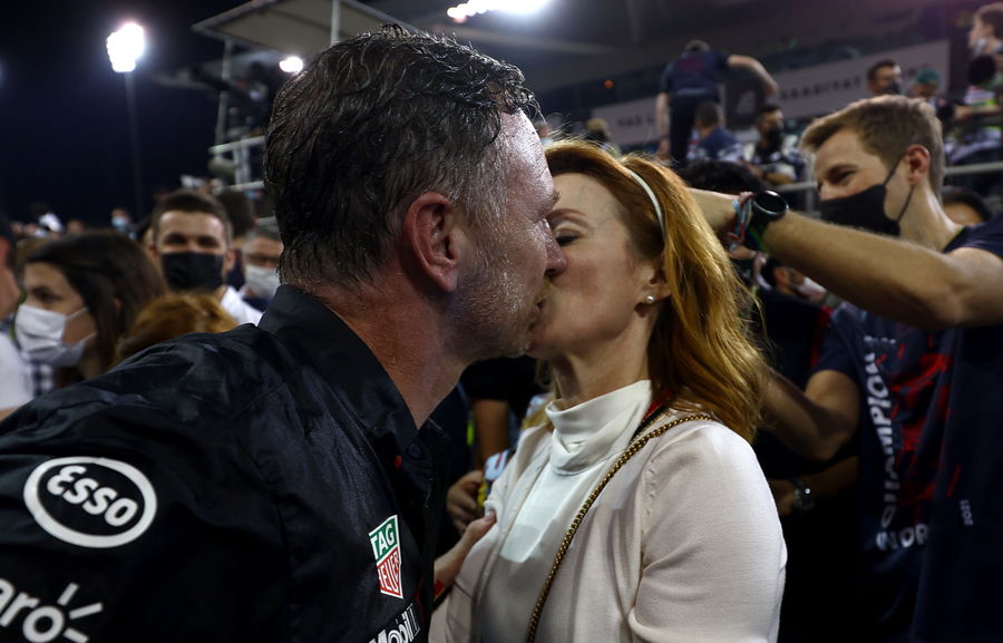 ABU DHABI, UNITED ARAB EMIRATES – DECEMBER 12: Red Bull Racing Team Principal Christian Horner celebrates with his wife Geri Horner in parc ferme during the F1 Grand Prix of Abu Dhabi at Yas Marina Circuit on December 12, 2021 in Abu Dhabi, United Arab Emirates. (Photo by Mark Thompson/Getty Images)