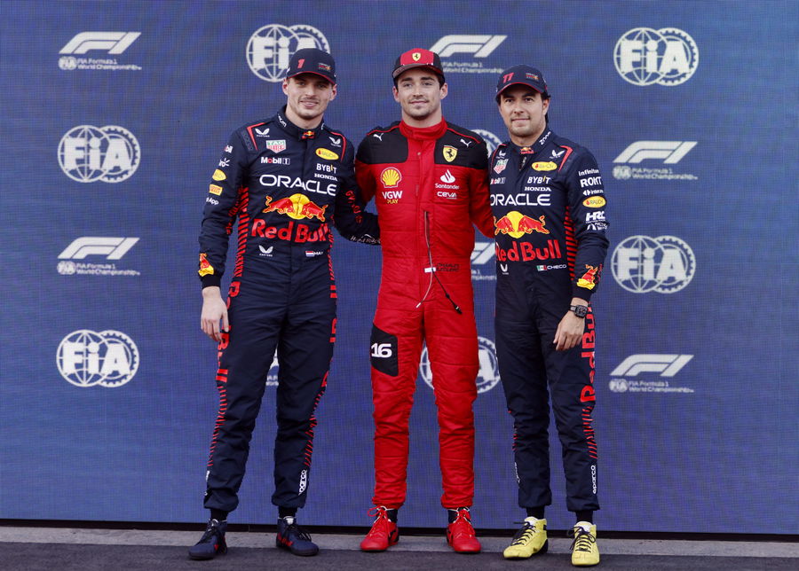 Formula One F1 – Azerbaijan Grand Prix – Baku City Circuit, Baku, Azerbaijan – April 28, 2023 Ferrari’s Charles Leclerc poses for a picture after qualifying in pole position alongside second placed Red Bull’s Max Verstappen and third placed Red Bull’s Sergio Perez REUTERS/Maxim Shemetov
