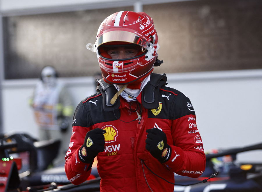 Formula One F1 – Azerbaijan Grand Prix – Baku City Circuit, Baku, Azerbaijan – April 28, 2023 Ferrari’s Charles Leclerc celebrates after qualifying in pole position REUTERS/Maxim Shemetov