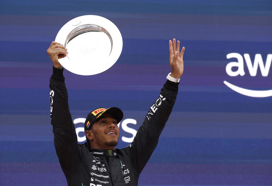 Formula One F1. Spanish Grand Prix. Circuit de Barcelona-Catalunya. Barcelona. Spain. Mercedes’ Lewis Hamilton celebrates with a trophy on the podium. After finishing second pace in the Spanish Grand Prix REUTERS/Albert Gea