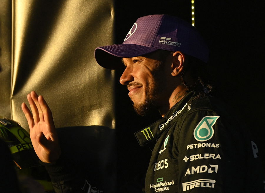 Formula One F1 – Australian Grand Prix – Melbourne Grand Prix Circuit, Melbourne, Australia – April 2, 2023. Mercedes’ Lewis Hamilton celebrates his second placed finish REUTERS/Jaimi Joy