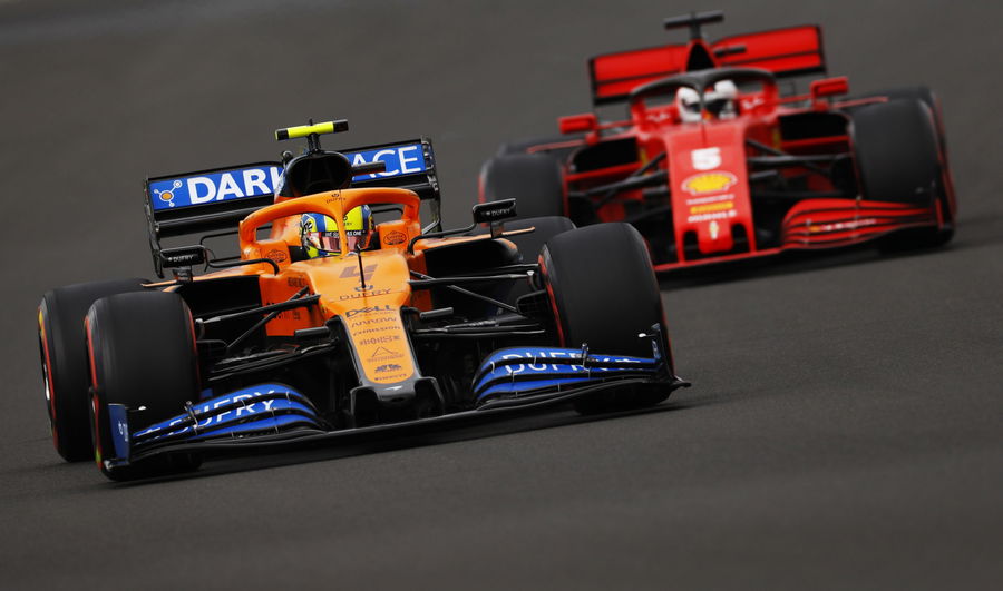 BUDAPEST, HUNGARY – Lando Norris of Great Britain driving the (4) McLaren F1 Team MCL35 Renault leads Sebastian Vettel of Germany driving the (5) Scuderia Ferrari SF1000 during qualifying for the F1 Grand Prix of Hungary at Hungaroring in Budapest, Hungary. (Photo by Leonhard Foeger/Pool via Getty Images)